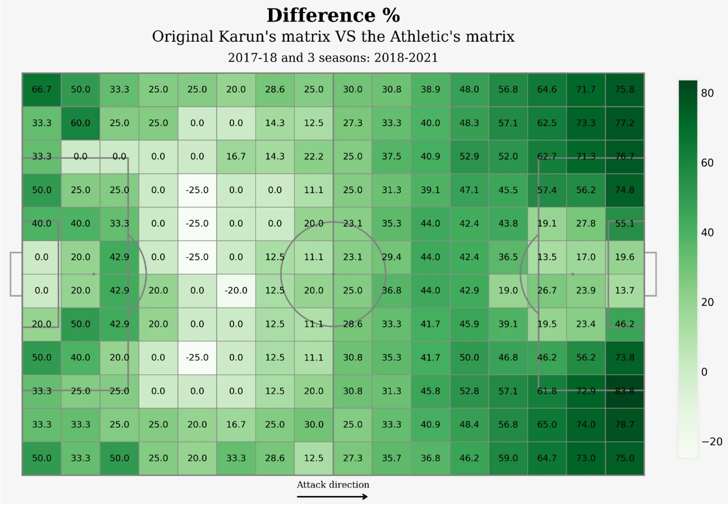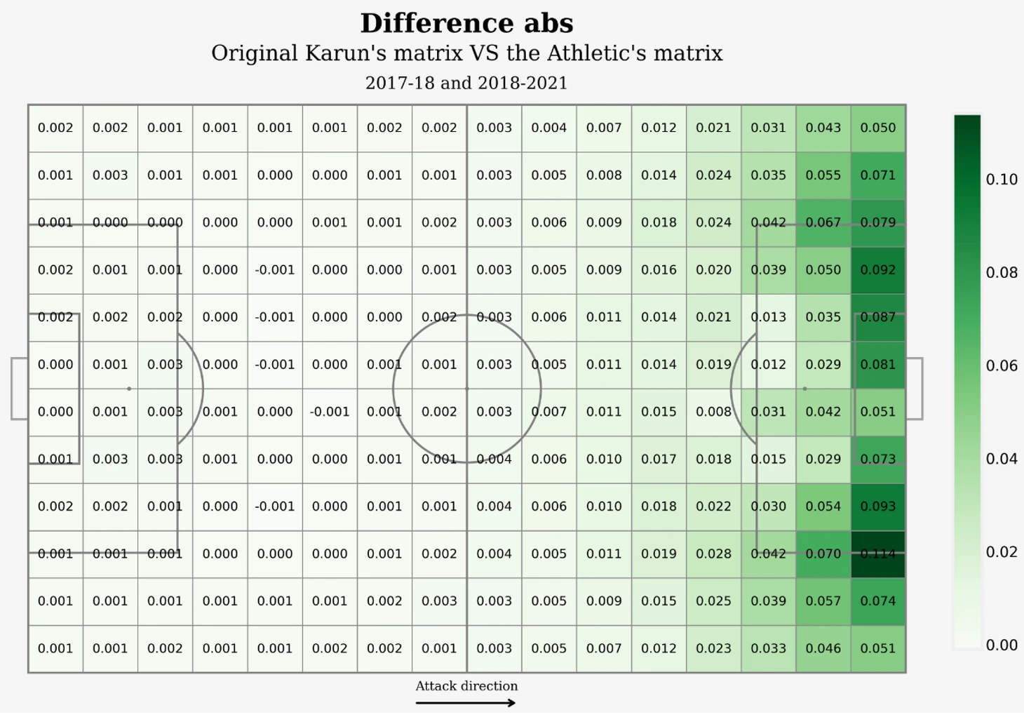 Ниже представлена разница в абсолютных величинах между двумя матрицами. Видно, что значения xT в финальной трети поля в окрестностях штрафной площади для зон матрицы автора модели несколько превосходят аналогичные значения для матрицы, представленной на the Athletic.