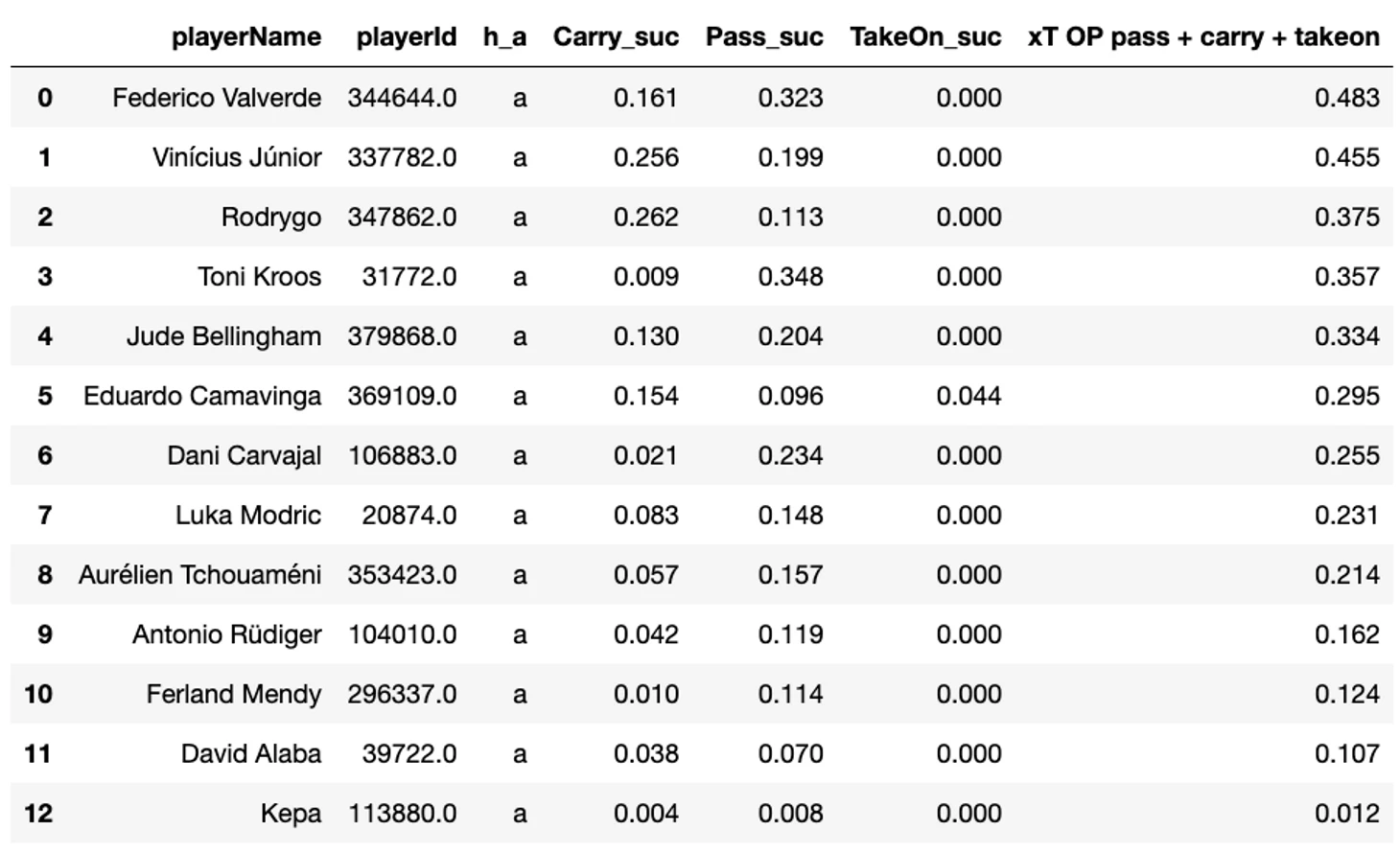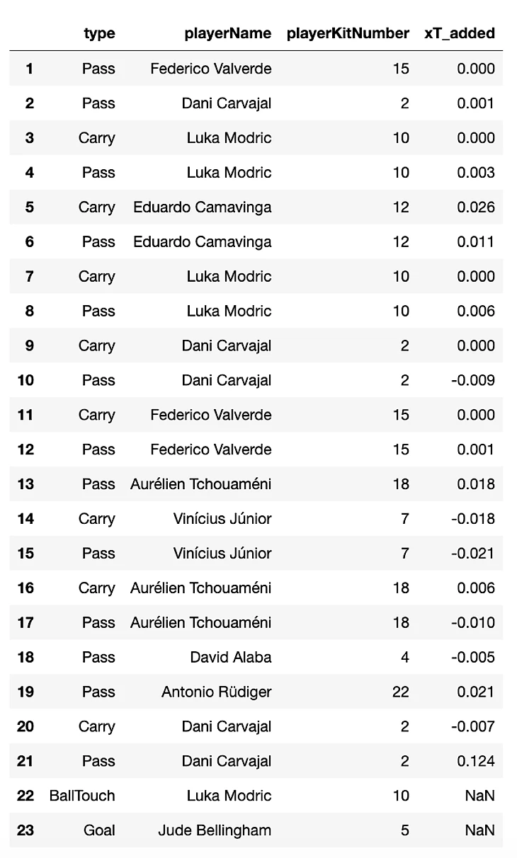 В таблице ниже отсортированы все футболисты Реала с суммарными значениями за матч по метрике xT. (Модрич без xT за BallTouch)