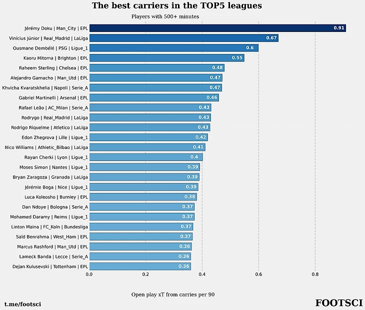 Лучшие футболисты Европы по создаваемой опасности через продвижения мяча на дриблинге в TOP5 лигах.
