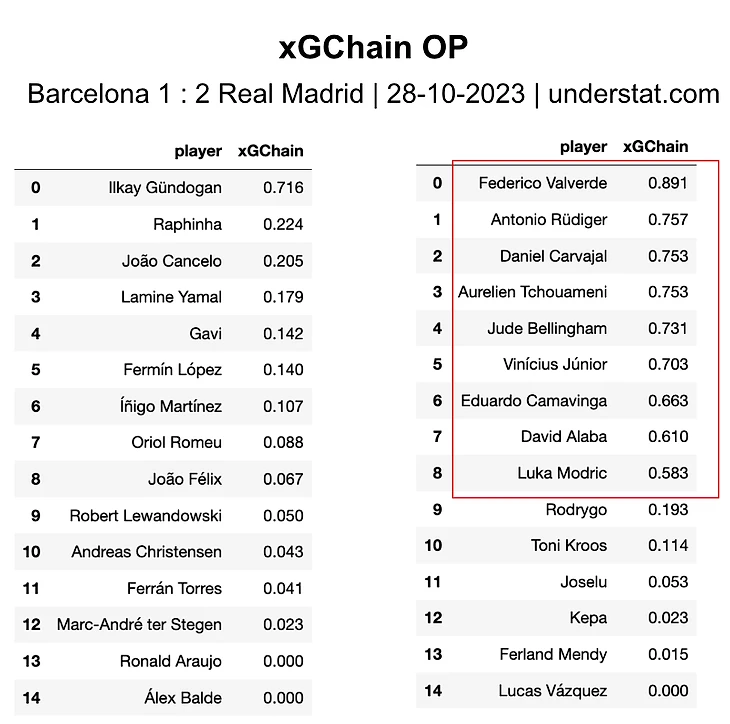 Ниже рассмотрен пример выделения цепочки владения (possession chain) и разметки действий метрикой xGChain в рамках одного из владений Барселоны в матче против Реал Мадрида от 28-10-2023.