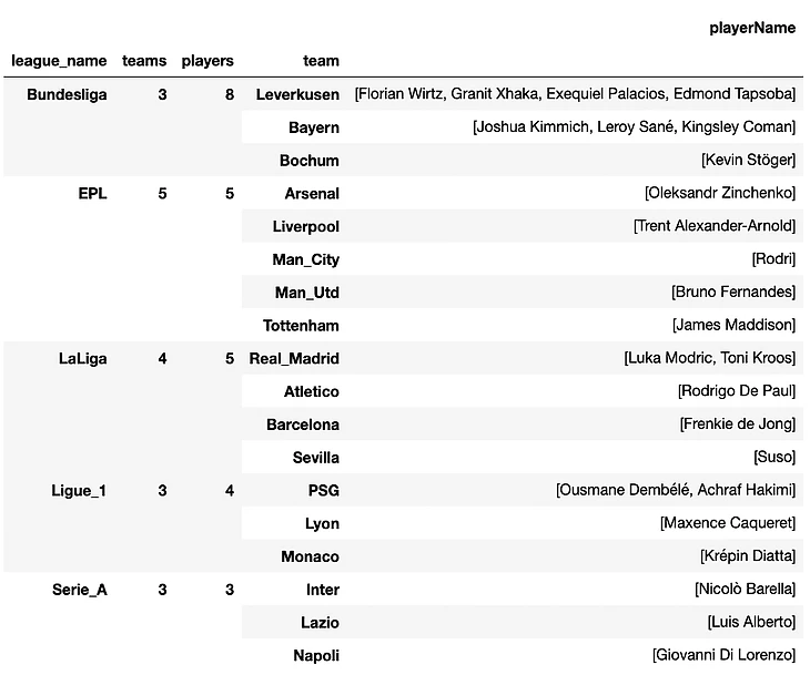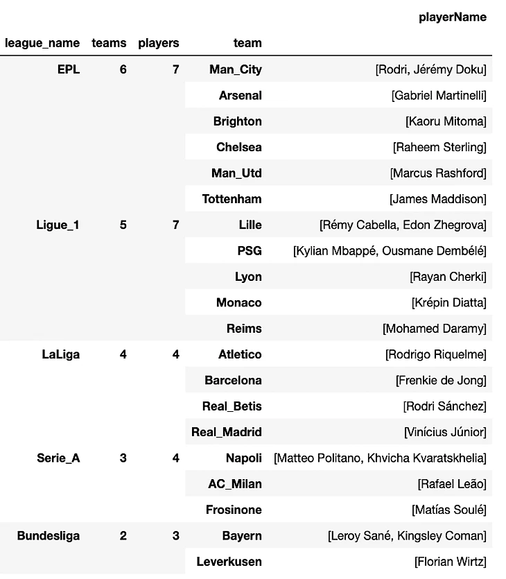 Итоговая матрица по ТОП5 лигам, которая будет использоваться далее во всех последующих визуализациях в этой и других статьях.