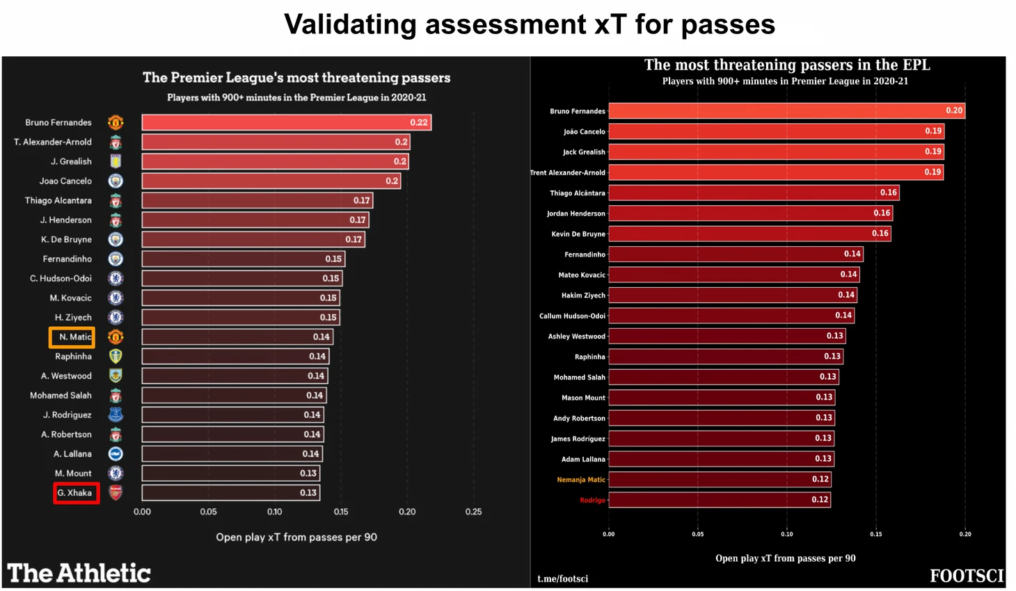 Видно, что в целом рейтинги довольно похожи. Из 20 футболистов в исходном рейтинге почти все присутствуют в обновленном перечне. Единственное исключение - вместо Джаки в наш рейтинг попал Родриго. Также можно отметить некоторое отличие в итоговом месте Матича, который из середины рейтинга опустился в конец. При этом наблюдается некоторое смещение в 1-2 сотых xT между приведенными перечнями.