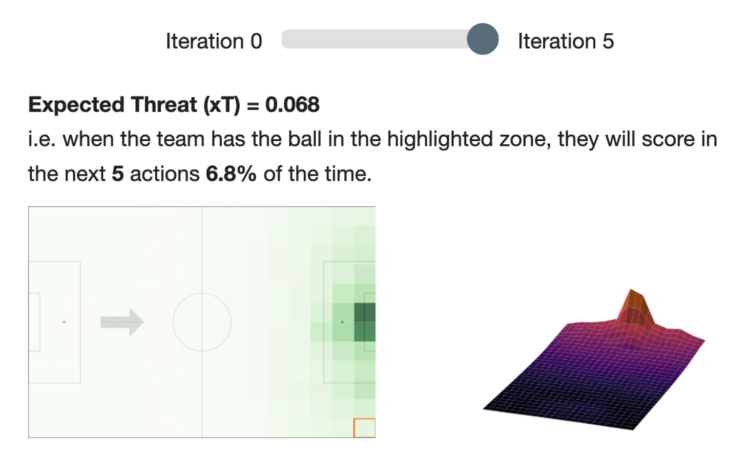 По сути можно смотреть на xT как на оценку того, как изменится xG потенциального удара, которой мог бы быть нанесен через N действий при перемещении мяча в заданную точку футбольного поля.