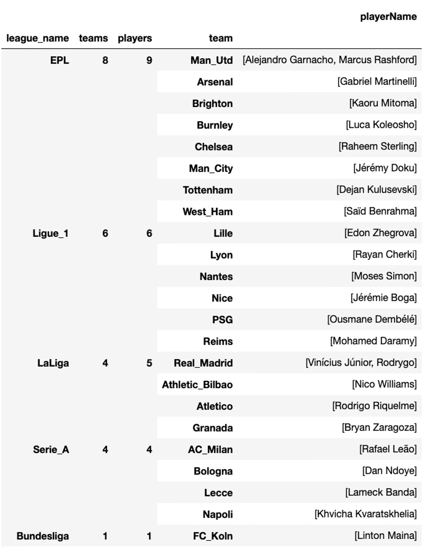 Интересная картина наблюдается для Бундеслиги, которую к сожалению я почти не смотрю. В рейтинге ТОП25 футболистов, создающих опасность через продвижение мяча, есть только один игрок. В моменте кажется, что это может быть свидетельством высокого уровня оборонительной игры в целом по всей лиге и как следствие повышенной сложностью продвижения мяча через дриблинг. Так же это может объясняться отсутствием соответствующих игроков с сильными индивидуальными навыками по продвижению мяча.