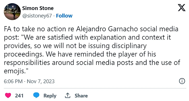 Журналист BBC Sport Саймон Стоун написал следующее: «FA не будет предпринимать никаких действий в связи с постом Алехандро Гарначо в социальных сетях: «Мы удовлетворены объяснениями и контекстом, который он предоставил, поэтому мы не будем возбуждать дисциплинарное разбирательство. Мы напомнили игроку о его ответственности за сообщения в социальных сетях и использовании эмодзи».