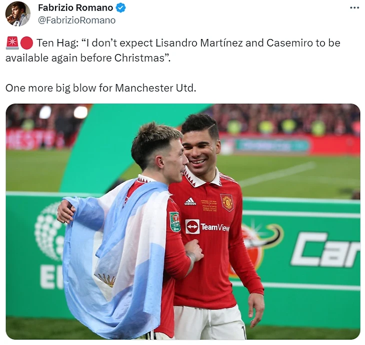 Мартинес и Каземиро не смогут помочь «Манчестер Юнайтед» в ближайших матчах, сообщил Тен Хаг. Слова тренера передает Фабрицио Романо: