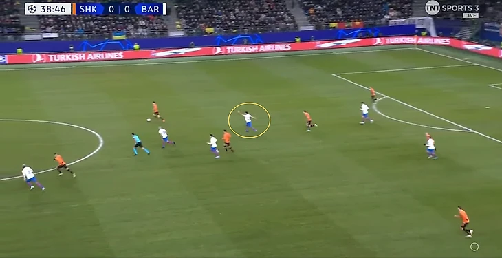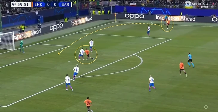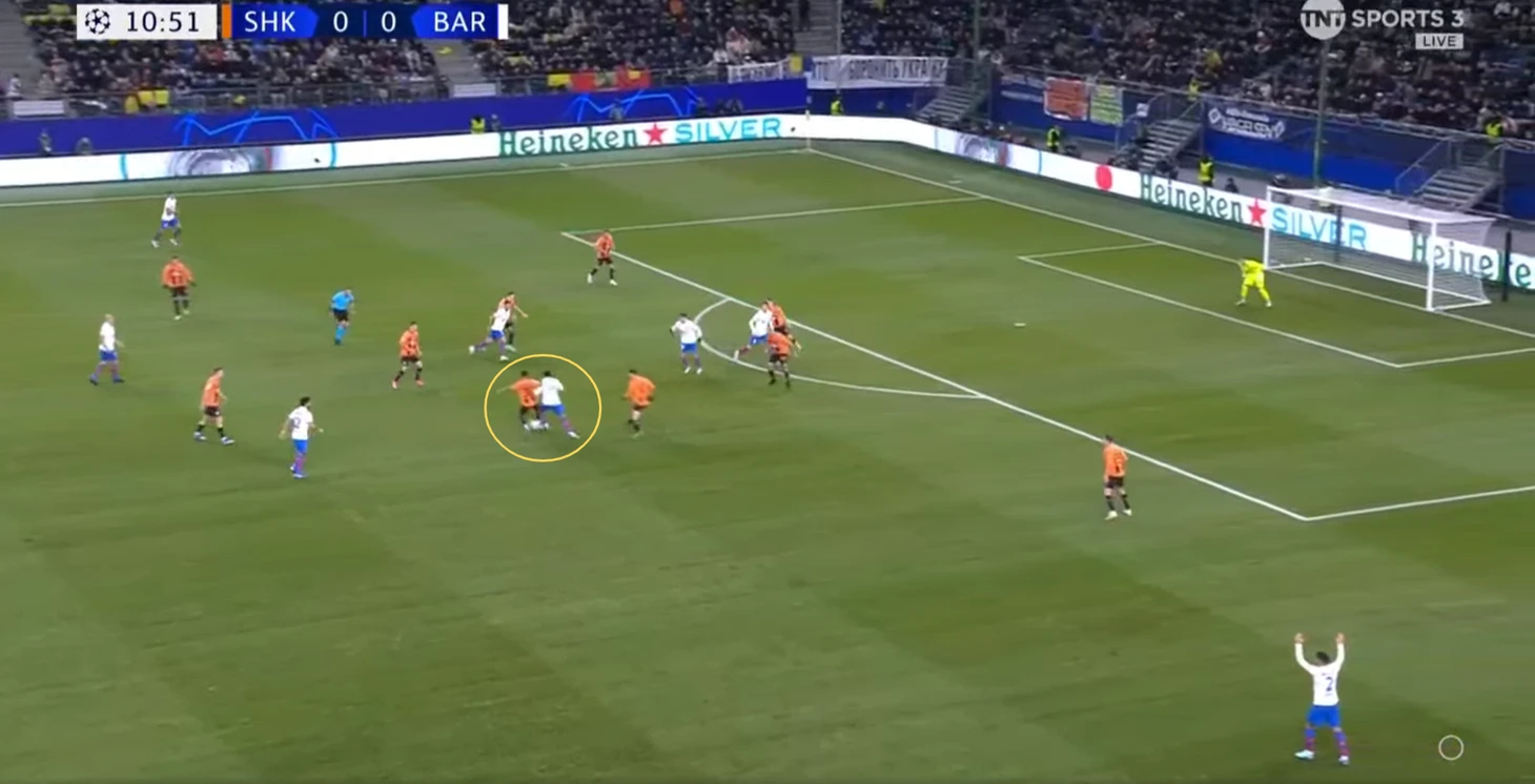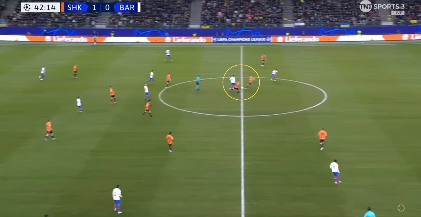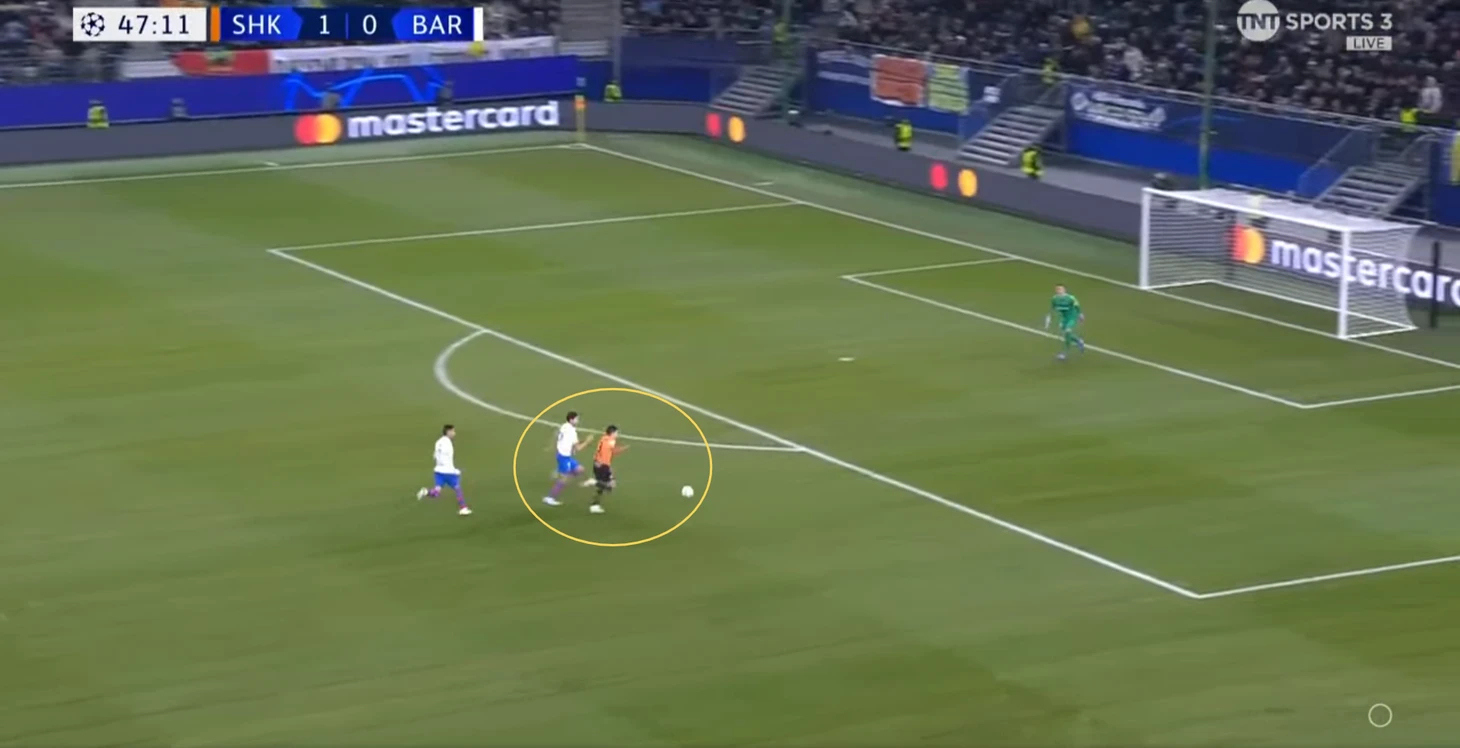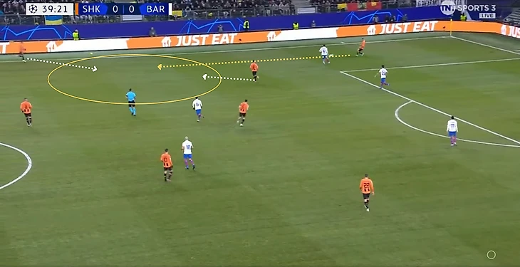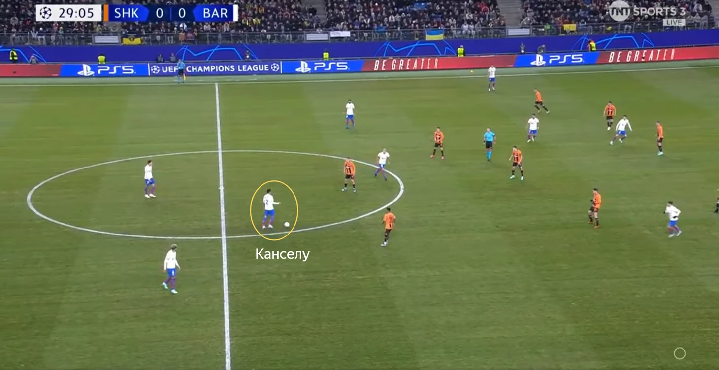 Дальше атака переходила на правый фланг. И снова: команда Хави вроде бы и идёт в прессинг, но действует недостаточно плотно, оставляя свободные зоны. «Шахтёр» снова выходит.