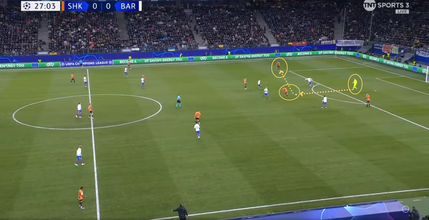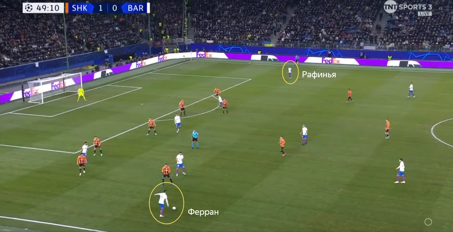 Пятёрка в атакующей линии давала дополнительного игрока, но команда Хави не использовала это преимущество. Основная причина – медленное движение мяча (плюс своевременные перемещения игроков «Шахтёра»). Здесь Рафинья абсолютно свободен на правом фланге, но пока Ферран переведёт на него мяч, Невертон уже накроет бразильца и не позволит спокойно принять мяч.