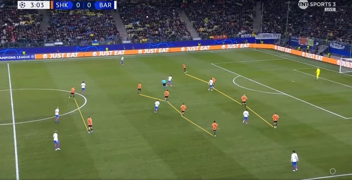 При этом характер встречи сильно отличался от матча против «Реал Сосьедада». «Шахтёр» не встречал «Барсу» высоким и интенсивным прессингом на постоянной основе (PPDA = 16.8). Украинцы (несмотря на стремление к симпатичному футболу) не отличаются склонностью к активному давлению. Чаще встречают соперника в среднем блоке 4-4-2.