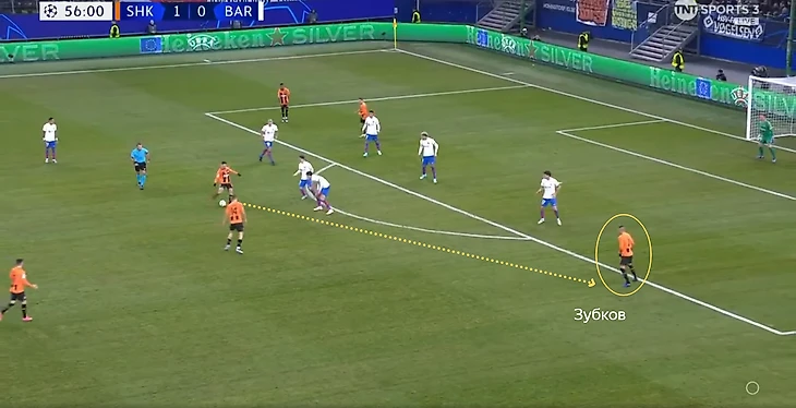 В этом моменте свободный Зубков получает мяч, а дальше катит в штрафную набегающему Сикану. Ни Гави, ни Кристенсен не успевают за украинцем. Спасал Тер Штеген.
