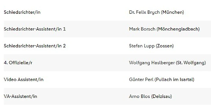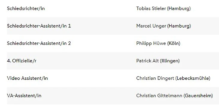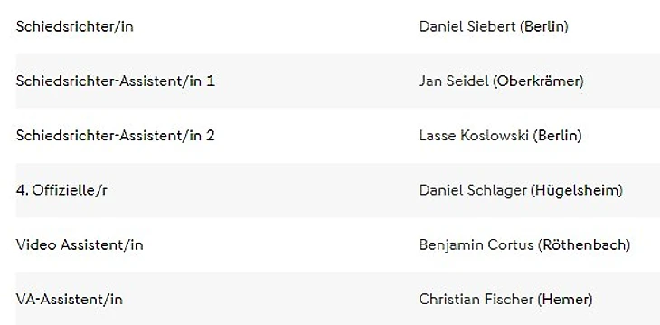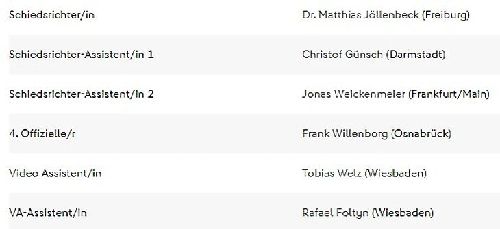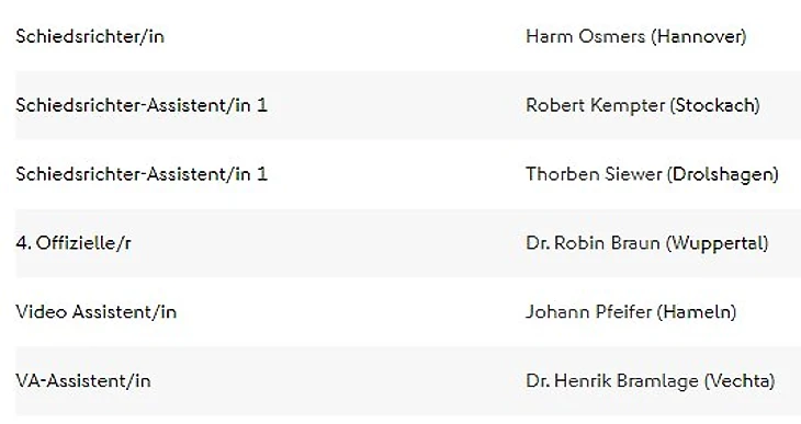 Судейство: Felix Zwayer (SR), Marco Achmüller (SR-A. 1), Marcel Pelgrim (SR-A. 2), Dr. Arne Aarnink (4. Offizieller), Sascha Stegemann (VA), Eduard Beitinger (VA-A)