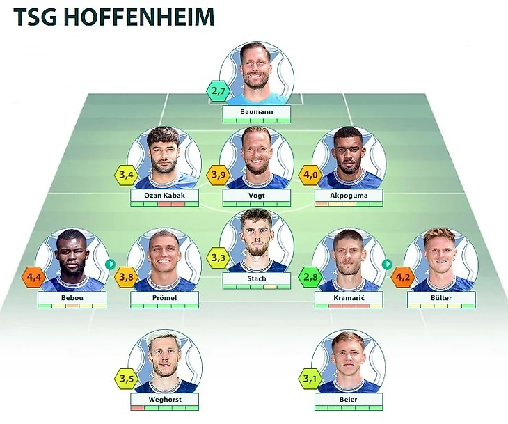 TSG: Baumann - Kabak, Vogt, Akpoguma - Bebou, Stach, Bülter - Prömel, Kramarić - Weghorst, Beier