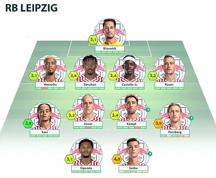 RBL: Blaswich - Henrichs, Simakan, Castello, Raum - Schlager, Kampl - Xavi, Baumgartner - Openda, Šeško