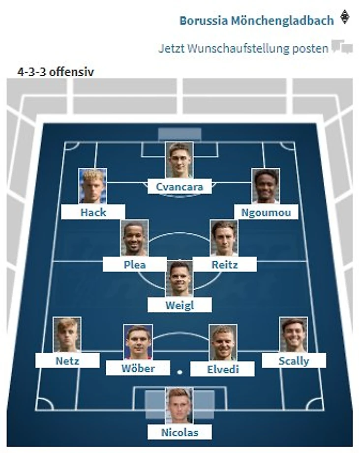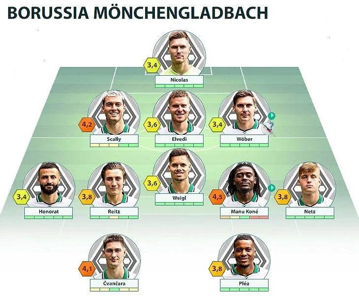 BMG: Nicolas - Scally, Elvedi, Wöber, Netz - Koné, Weigl - Honorat, Pléa, Ngoumou - Čvančara