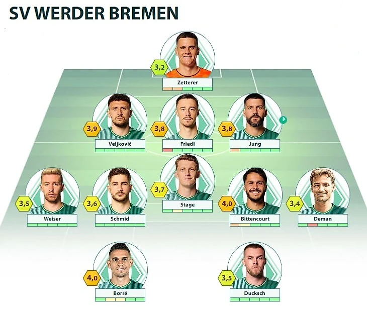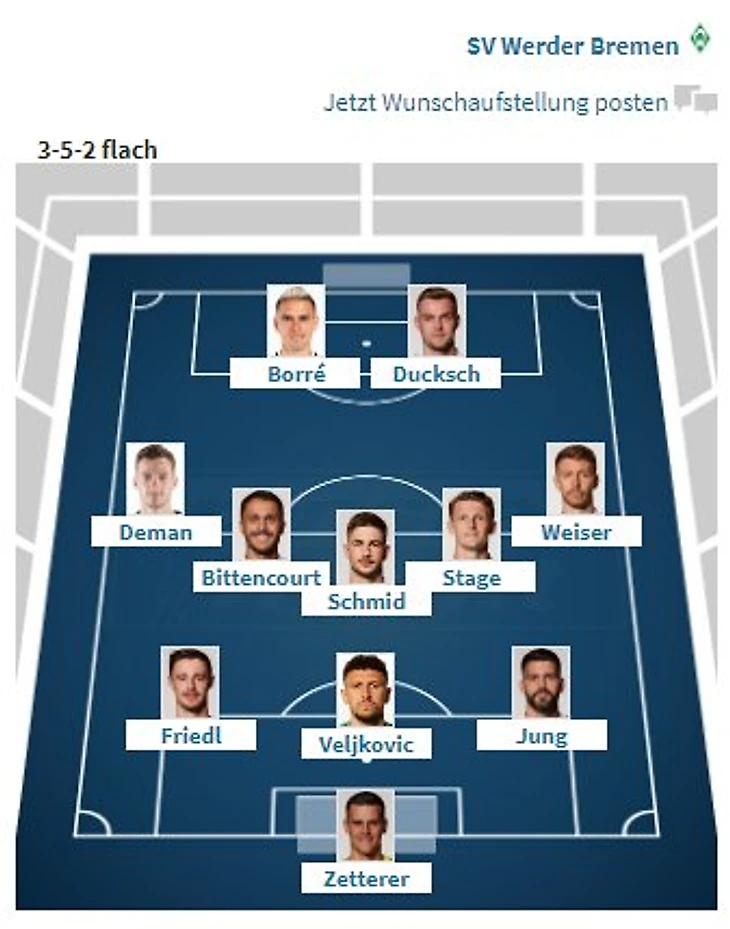 SVW: Zetterer - Veljković, Friedl, Jung - Weiser, Stage, Deman - Schmid, Bittencourt - Borré, Ducksch