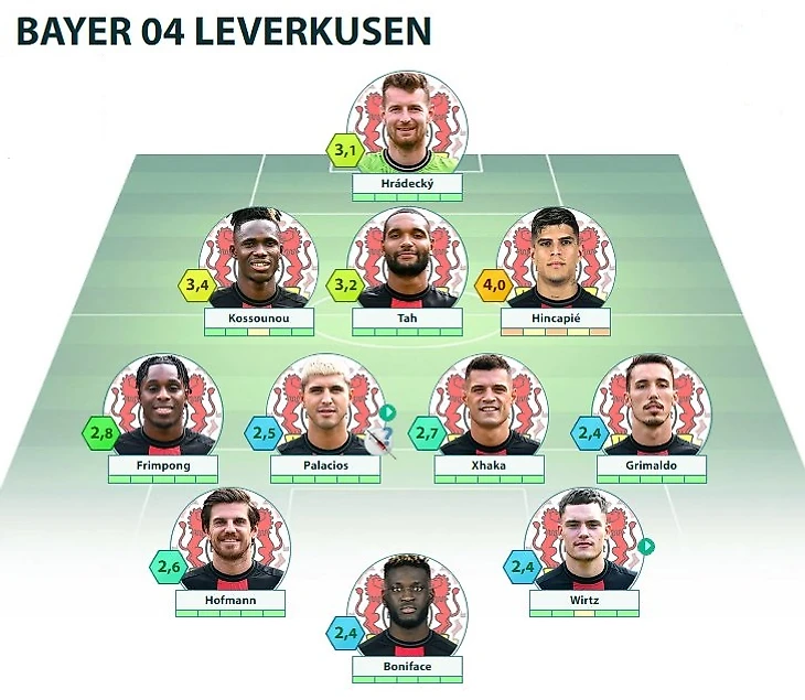 B04: Hrádecký - Kossounou, Tah, Hincapie - Frimpong, Palacios, Xhaka, Grimaldo - Hofmann, Wirtz - Boniface
