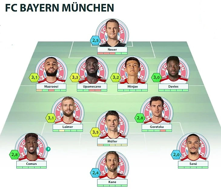 FCB: Neuer - Mazraoui, Upamecano, Kim, Davies - Laimer, Goretzka - Coman, Müller, Sané - Kane