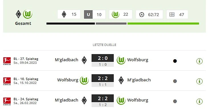 Любимые соперники друг против друга: «Боруссия Менхенгладбах» не проиграла ни в одном из семи последних поединков Бундеслиги против «Вольфсбурга» (три победы, четыре ничьи) и не проиграла в четырех домашних матчах против «волков» (две победы, две ничьи). Однако: гости из «Autostadt» выиграли у «жеребят» 22 раза (как у «Франкфурта» и «Штутгарта») – ни у одной другой команды больше не было.
