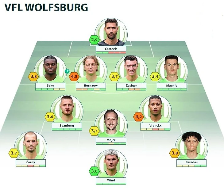 WOB: Casteels - Maehle, Bornauw, Zesiger, Rogério - Svanberg, Vranckx - Černý, Majer, Paredes - Wind