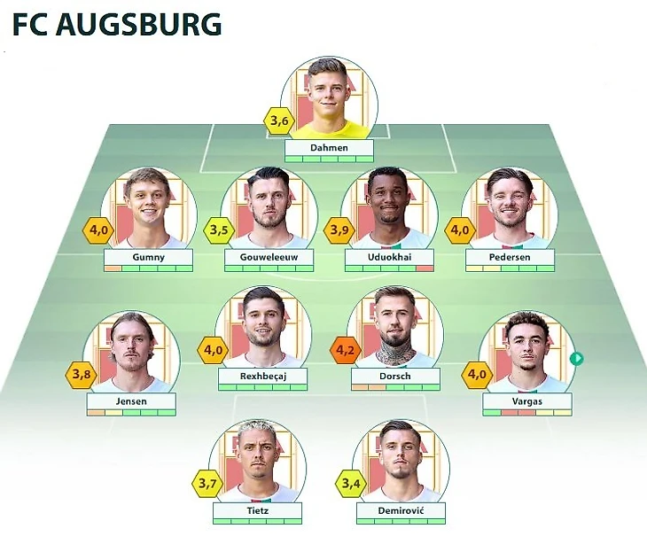 FCA: Dahmen - Gumny, Gouweleeuw, Uduokhai, Pedersen - Rexhbecaj, Dorsch - Jensen, Michel, Demirović - Tietz