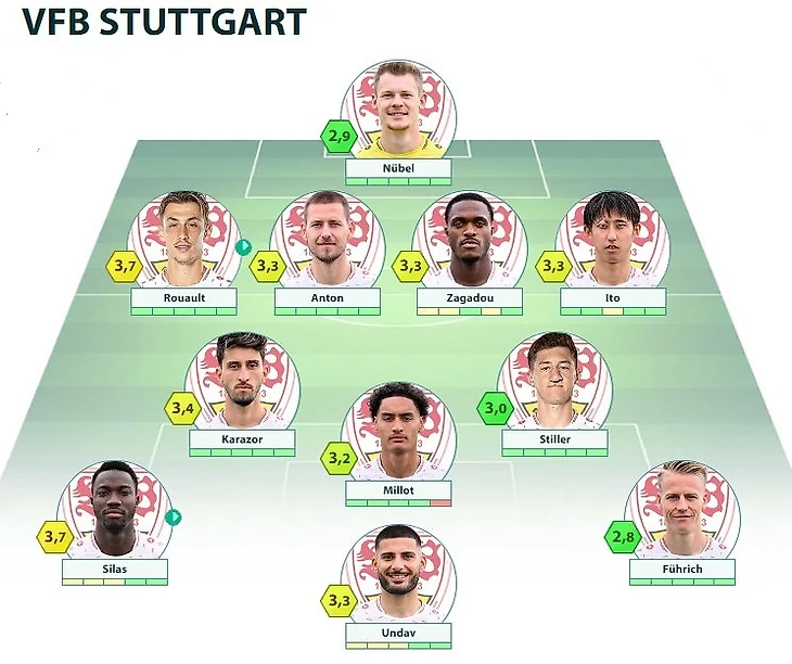 VFB: Nübel - Stenzel, Anton, Rouaoult, Ito - Karazor, Stiller - Silas, Millot, Führich - Undav