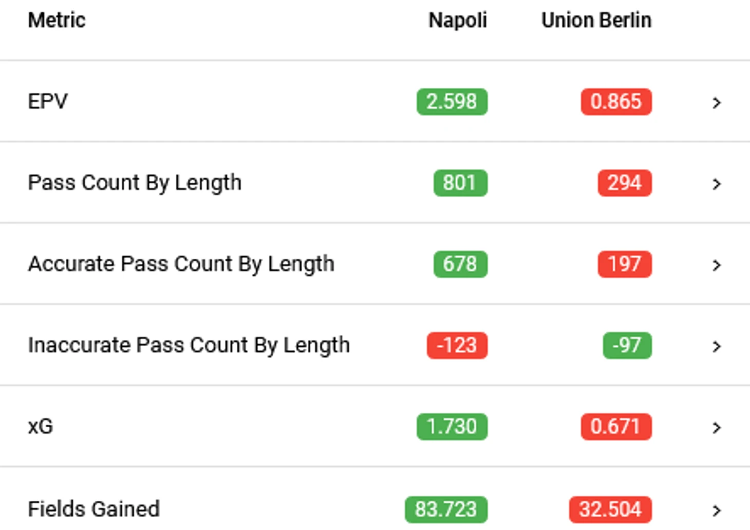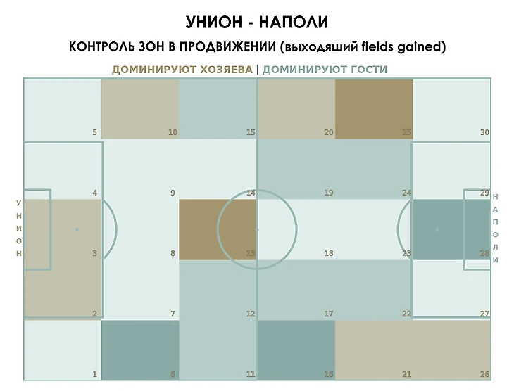 Если за критерий контроля на том или ином участке поля взять показатель того, насколько команда больше или меньше соперника продвинула мяч из зоны, то отчетливо видно, что «Наполи» на левом фланге испытывал проблемы, а «Унион» здесь же был успешен. Такой сценарий стал возможен благодаря активной игре в атаке правого защитника неаполитанцев Ди Лоренцо, который постоянно либо занимал высокую позицию, либо излишне прижимался к центру.