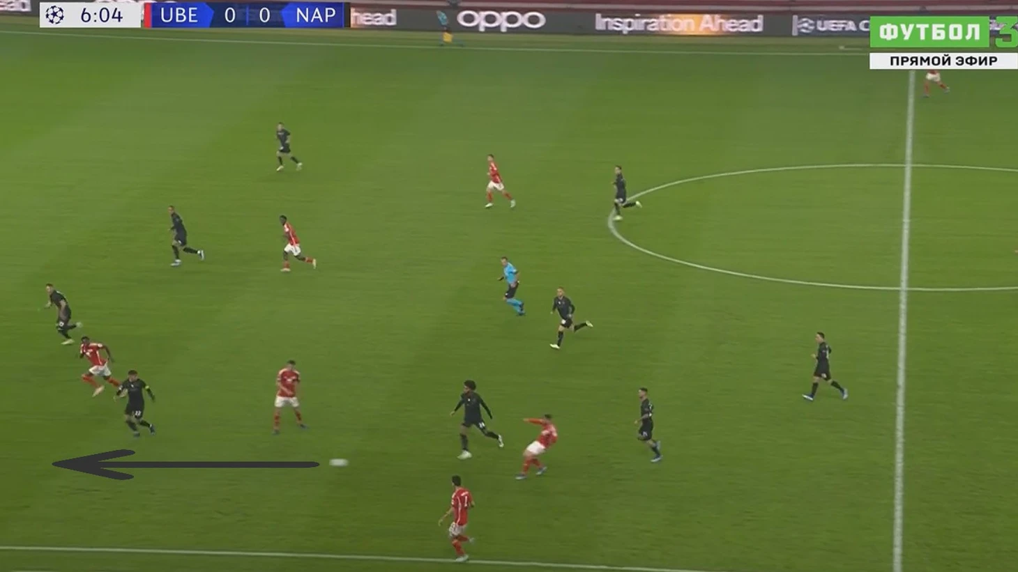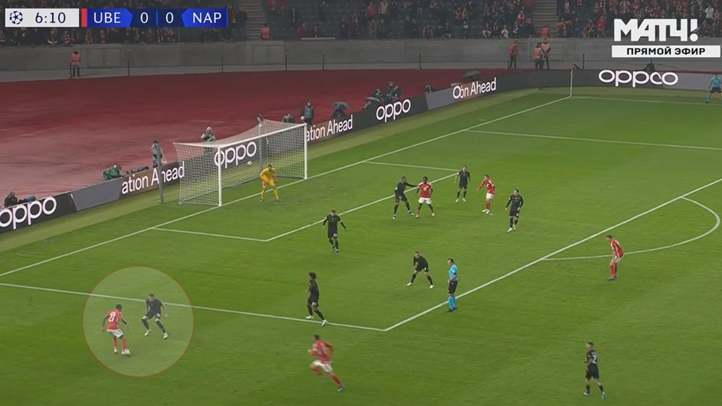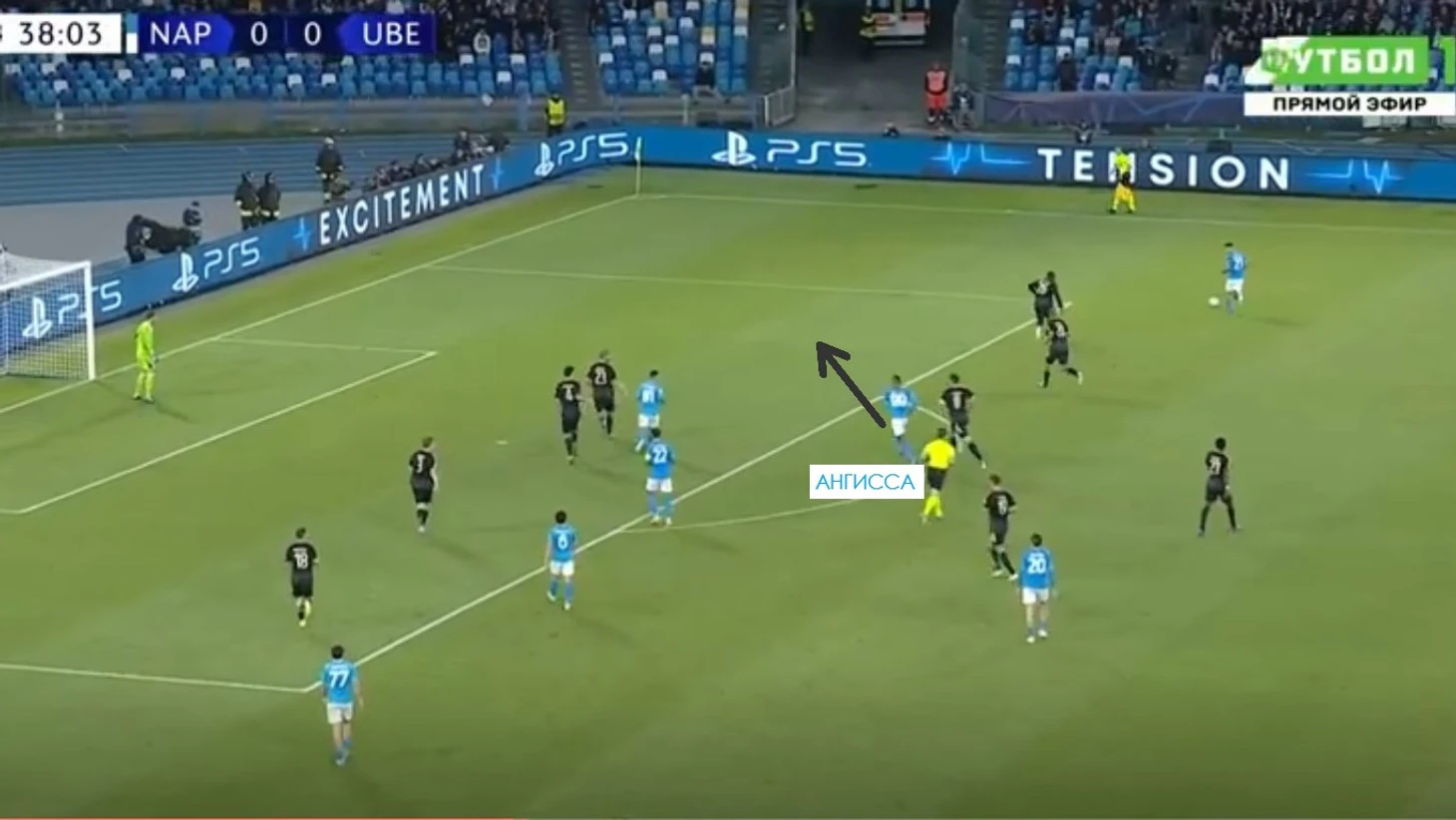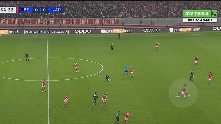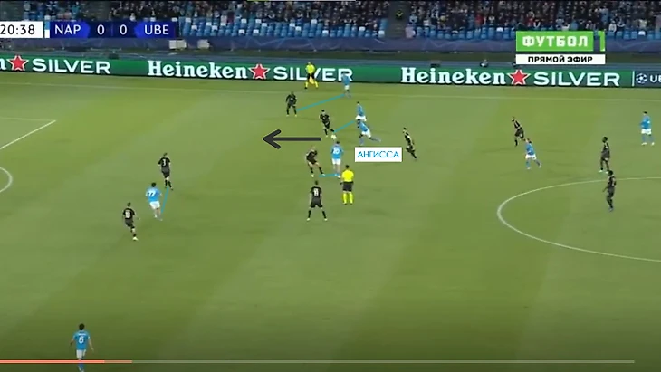 Во время голевой атаки «Наполи» тоже случился похожий эпизод, когда Замбу-Ангисса забежал за спину левому защитнику «Униона» Руссийону. Конкретно здесь не было обострения в следующем действии, однако постоянное раздергивание защитников в районе их штрафной приводило к еще более уверенному владению, так как они садились все глубже и все чаще теряли контроль в своих зонах, что в итоге и привело к забитому голу через пол-минуты.