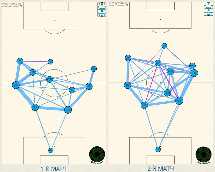 Как видно из карты передач, во втором матче координаты Лоботки (CDM) сместились вниз и вправо, как раз к тому флангу, где игроки «Униона» раз за разом вскрывали зону Ди Лоренцо. Да, координаты передач не могут отвечать за оборонительный перфоманс, однако, если взглянуть на координаты правого защитника (RB), то во втором матче они стали еще выше, наврятли без решения усилить здесь оборонительную позицию это стало бы возможным.