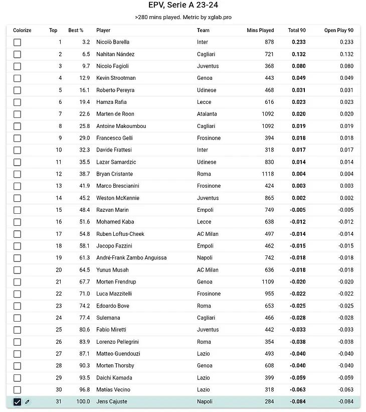 Каюсте с отрывом худший правый хавбек по ценности владения передач в итальянском чемпионате, плюс у него проблемы с приемом передач под давлением: не самый крепкий корпус он не компенсирует ни техникой, ни скоростью.