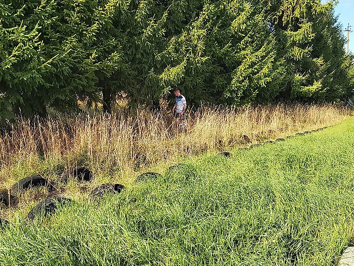 Оперевшись на покрышку, которыми обставлено все футбольное поле, он внимательно наблюдает за происходящим.
