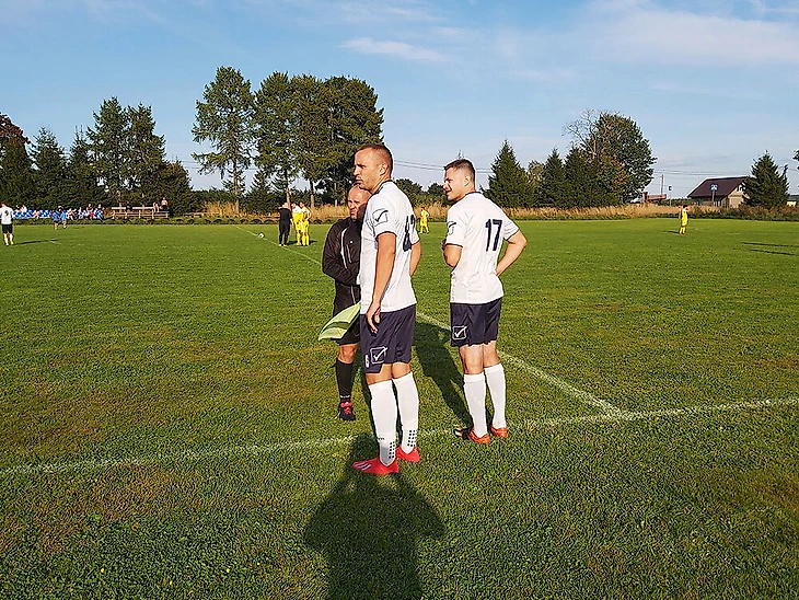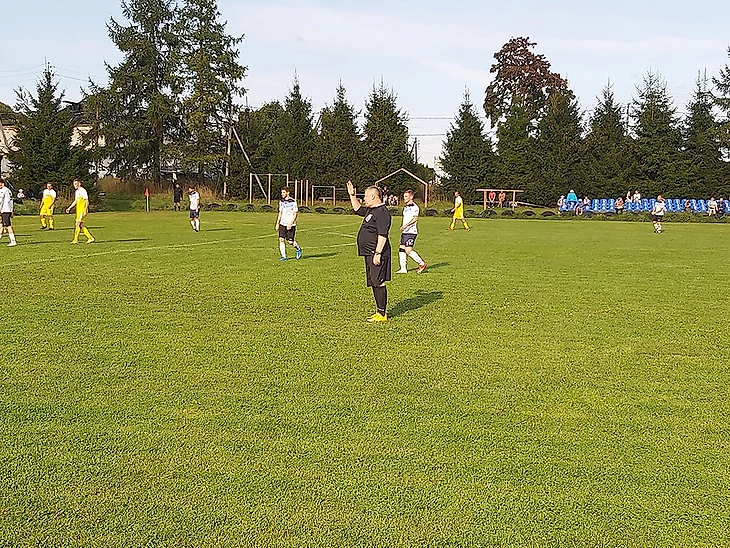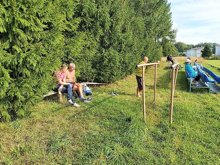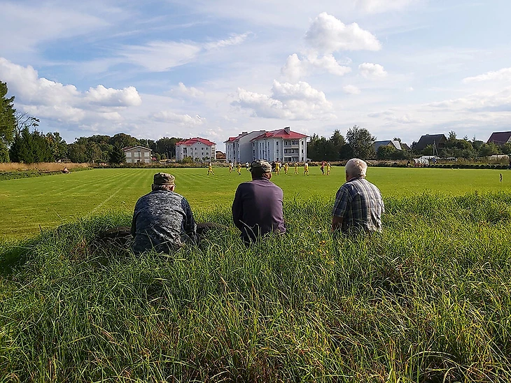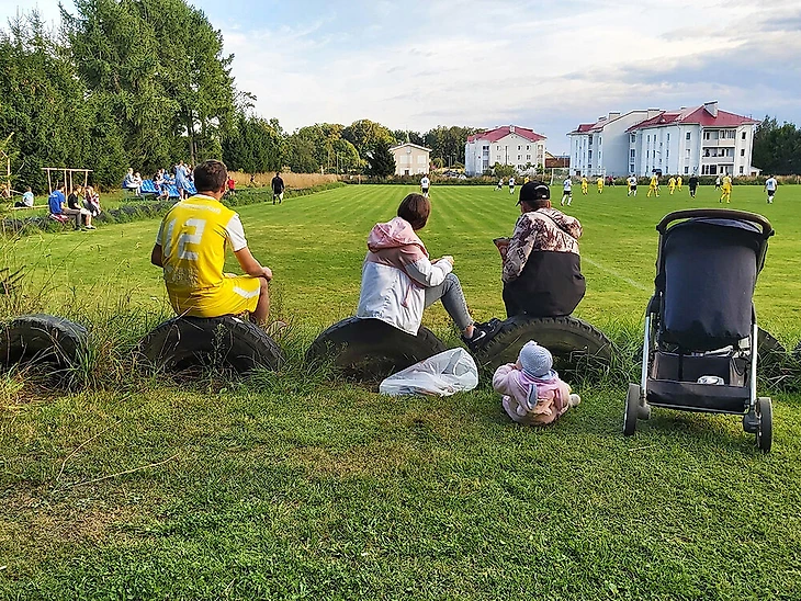 Посмотреть на игру третьей и пятой (последней) команд чемпионата пришло чуть больше десяти болельщиков. Часть болельщиков расположилась на трехрядной трибуне с пластиковыми креслами, по всей видимости, выполняющей роль сектор VIP. Часть разместилась на трехрядной трибуне с деревянными скамейками. А один мужичок обосновался на скамейке, стоявшей практически в лесном массиве, совмещая просмотр футбола с солнечными ваннами. До матча он неустанно рассказывал другому болельщику всякие истории, общий сюжет которых можно описать так: раньше было лучше, чем сейчас.