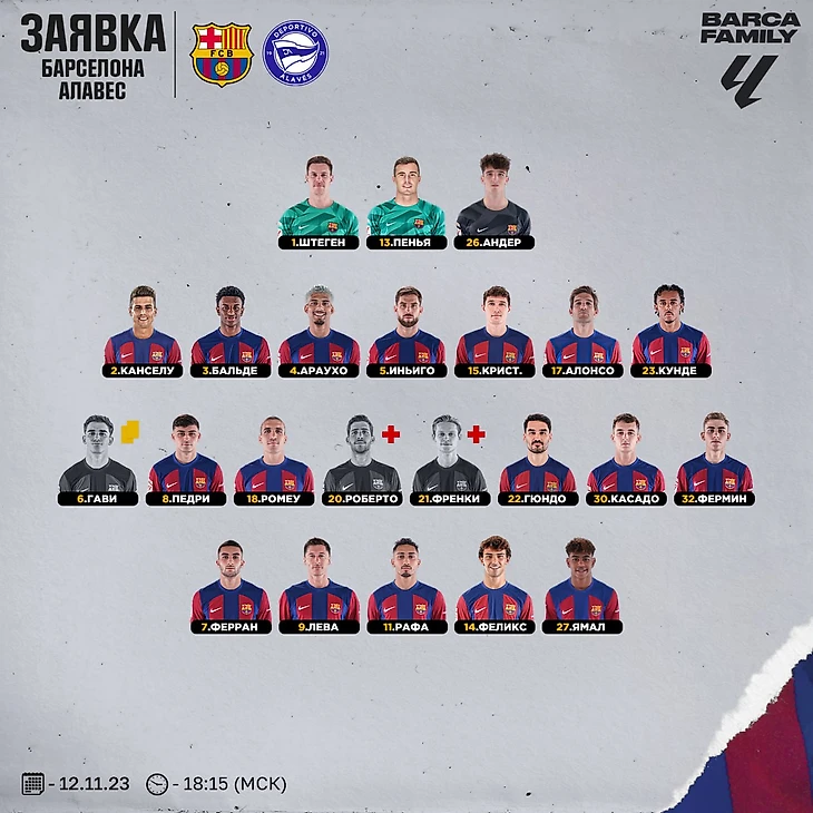 Сегодня состав больше похож на наши личные ожидания, но Хави любит удивлять в этом сезоне и вполне может вернуться к тройке защитников добавив Иньиго Мартинеса. Так что предлагаю и вам подумать и предложить свой вариант стартового состава на матч против «Алавеса» Пожелаем «Барселоне» удачи, а вас попросим поддержать нас плюсиком и подписаться на блог ✍️