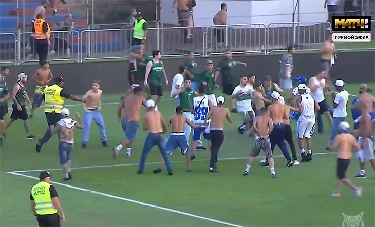 Сотрудники охраны пытались остановить это, но их было слишком мало. Безумные фанаты нещадно лупили друг друга. Били и кулаками в лицо, и ногами, и по несколько человек нападали на одного.