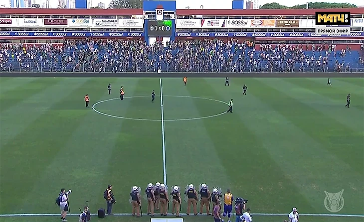 И это не какое-то подземелье, а элитная бразильская лига. Игру в прямом эфире показывал «Матч ТВ». А в концовке случилось вот такое.