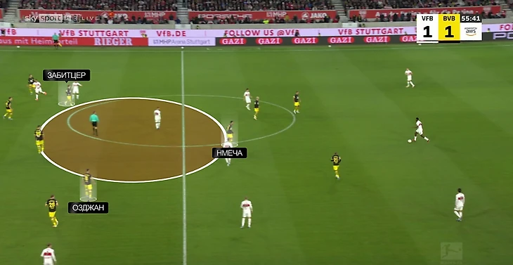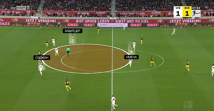 Например, весьма интересным ходом Терзича был отказ от обороны опорной зоны. Озджан и Забитцер садились ближе к защитникам и фланговым зонам, игравший выше Нмеча застревал в блоке с атакующими игроками, а в центре появлялась дыра: