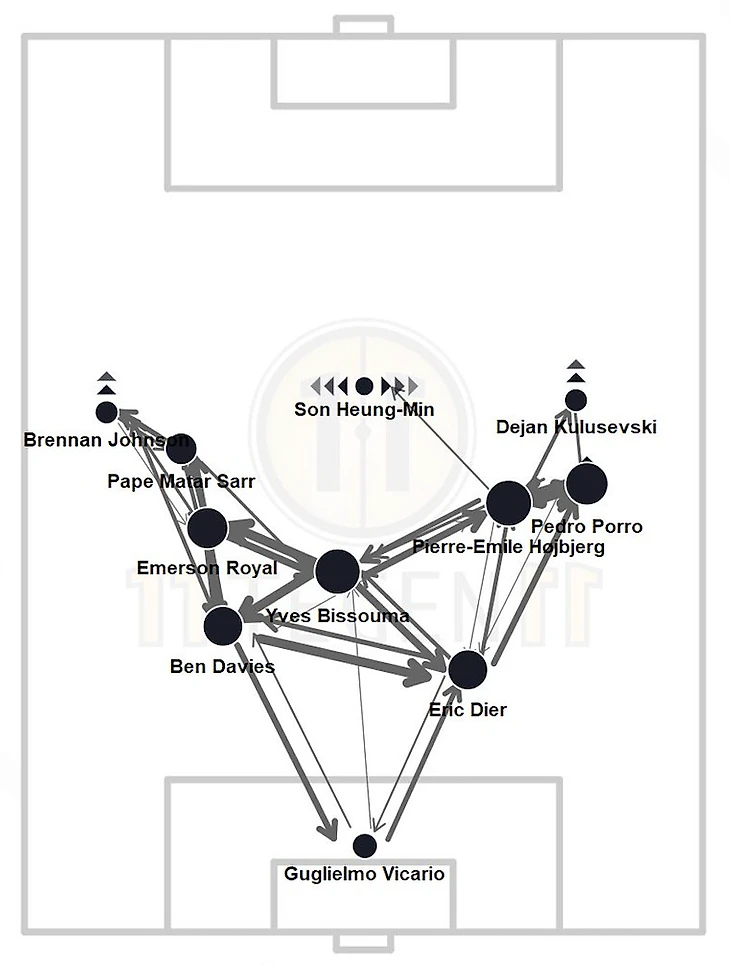 Особенно ощущалось отсутствие Мэддисона и Ромеро. Без Джеймса «Тоттенхэм» категорически плохо продвигал мяч. Стартуя десяткой, Мэддисон здорово распознает свободные зоны и опускается за мячом. Иногда чуть ли не в одиночку вытаскивает команду – так было в дерби с «Арсеналом», когда «шпор» прижали прессингом. Без него «Тоттенхэм» был практически беспомощен. Карта передач хорошо олицетворяет проблему. Много перепасовок на своей половине, минимум продвижения: