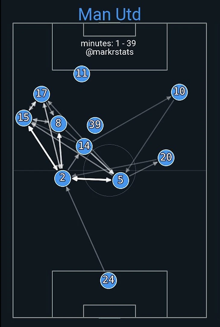 Против «Лутона» (1:0) идея получила развитие. Не просто разыгрывали в терпеливой манере, а еще и пытались воплотить памятные по «Аяксу» принципы Тен Хага. Один из них – когда на одном фланге создается численный перевес, а другой отдан под более вертикальное продолжение. Карта передач здорово отображает идею: