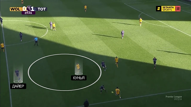 Часто англичанину противостоял Матеус Кунья – нападающий, который обожает опускаться за мячом и разгонять атаки. Дайер либо мешкал с решением, либо просто давал ему свободу (проявилось и в первом пропущенном голе):