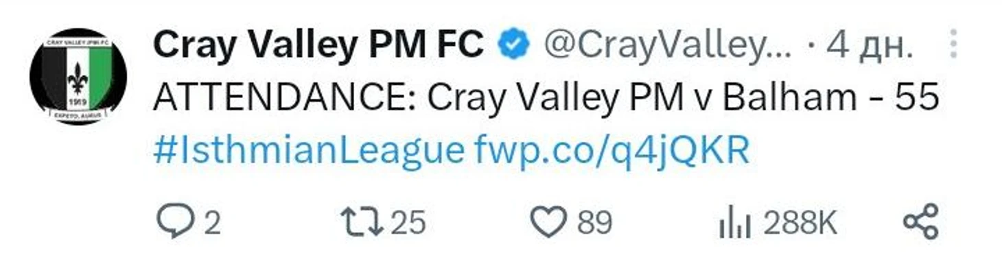 Особенно после объявления посещаемости на неделе, когда на «КВПМ» пришло, внимание, 55 зрителей. Правда, матч против «Балхэма» проходил в рамках Кубка Лондона, а за «КВПМ» вышла молодежь. Посещаемость ниже 100 обыденна для региональных кубков.