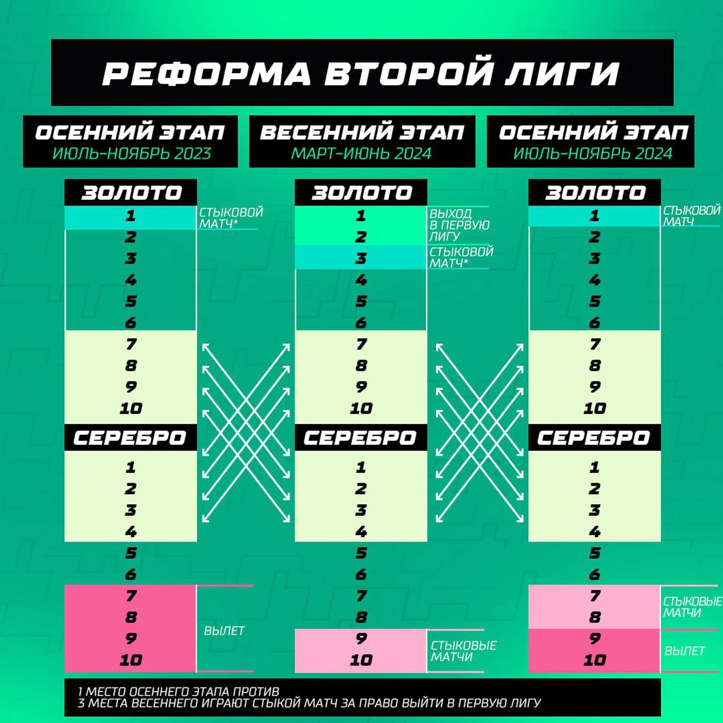 Коротко напомним суть перемен: Вторую лигу разделили на две. В Дивизионе А бьются за повышение по гибридной системе – с осенним и весенним турнирами. Этажом ниже – Дивизион Б, где четыре региональных зоны, которые с 2024-го перейдут на весну-осень.