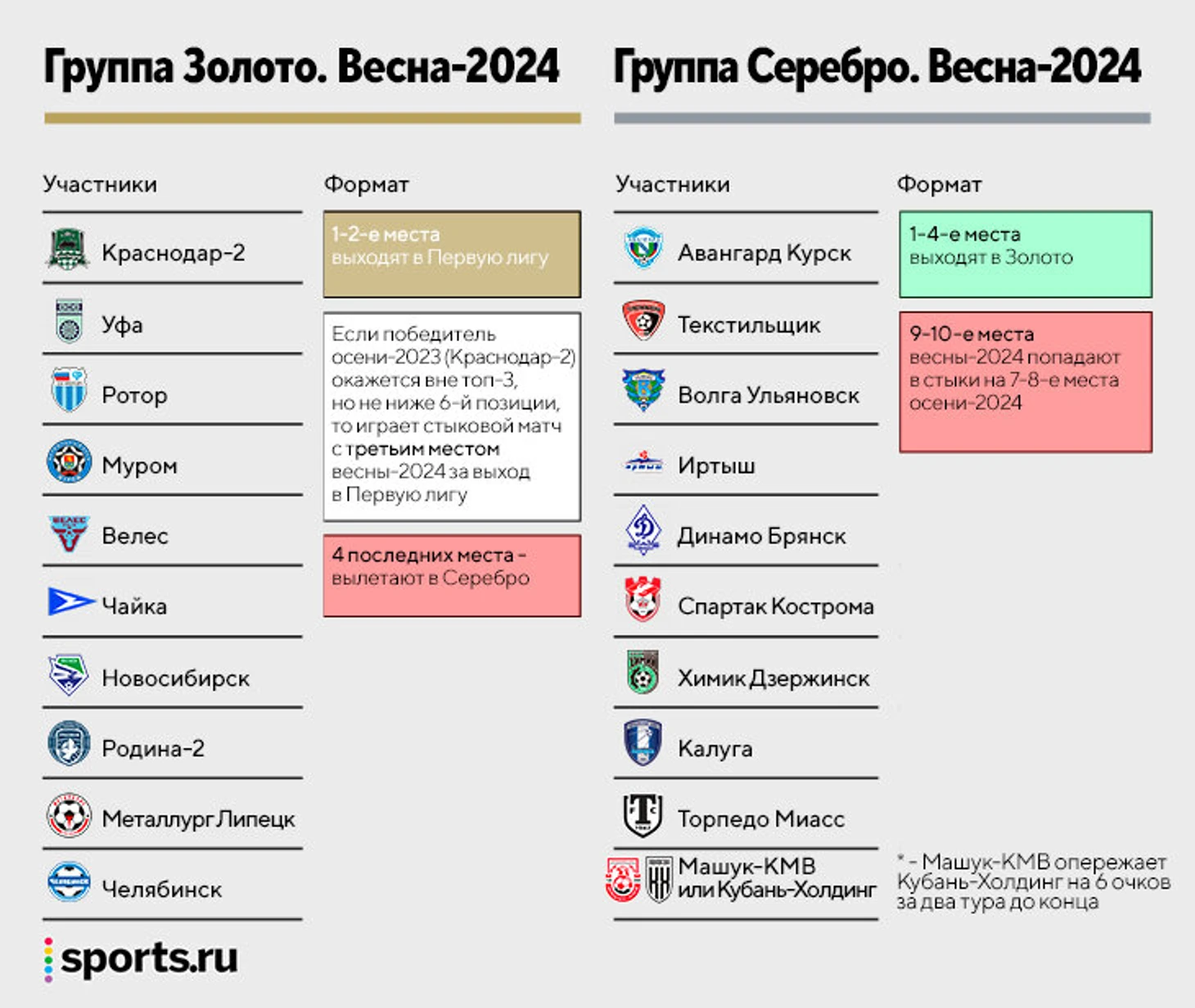 ● «Краснодар-2» выиграл Золотую группу и почти гарантировал как минимум место в стыках за Первую лигу. Если удержится в топ-3, то сразу пойдет выше. Если нет, побьется за повышение с третьей командой весеннего отрезка. Но если «Краснодар-2» по итогам весны вылетит из Золотой группы, то лишится права на стыки. В 2024-м все команды начнут с нуля – каждый с каждым в два круга.
