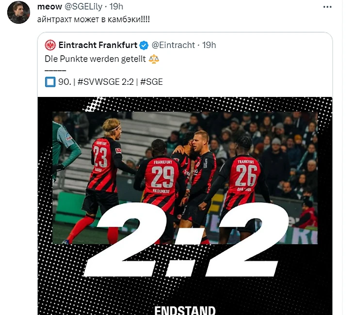 В матче против «Айнтрахта» хозяева вели со счетом 2:0, но не сумели сохранить победный счет – 2:2. Для «орлов» это уже шестой мирный исход матча в сезоне. Команда играет на «хорошо», а чтобы поменять свою оценку на «отлично», необходимо чаще побеждать.