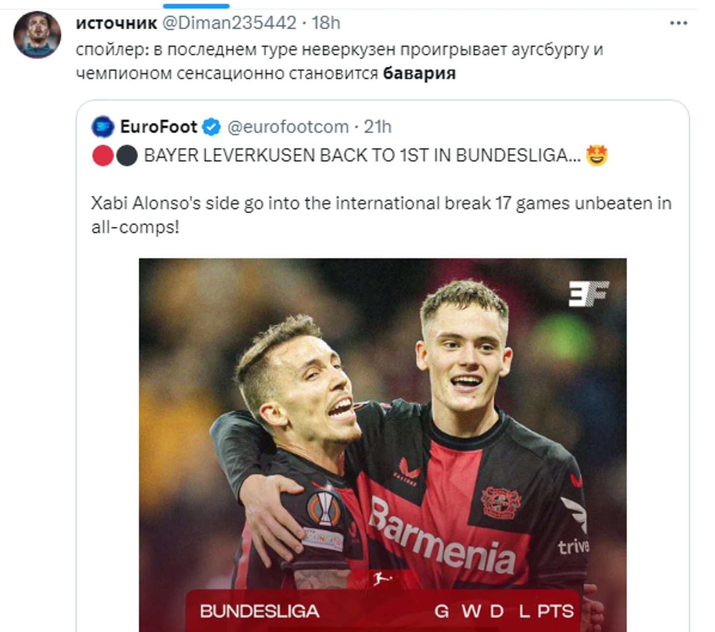 После одиннадцати туров у «Байера» десять побед, ничья и 31 очко. Ни одна команда в истории Бундеслиги не показывала лучших результатовю. «Аспириновые» повторили рекорд «Баварии» в сезоне 2015/16;