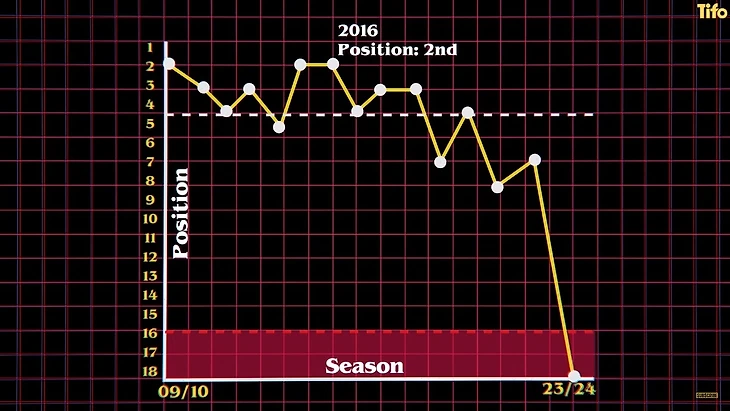 Но в 2008 году они последний раз выиграли титул, и за 15 лет, прошедших с тех пор, их форма в лиге пошла на убыль. В последний раз они финишировали вторыми в 2016 году, и затем - с 2019 года - не входили в четверку лучших, а в настоящее время вполне реален и вылет команды.