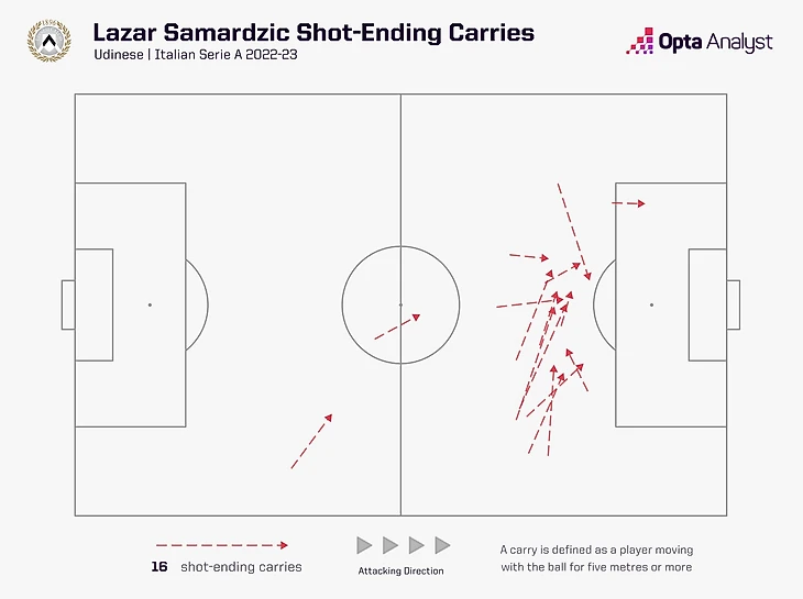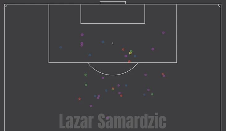 Самарджич просто обожает дальние удары - в прошлом сезоне 68% от общего числа его ударов (36) были нанесены из-за пределов штрафной площади, и четыре стали голевыми. Ценность этого навыка в том, что до удара дело доходит почти всегда благодаря индивидуальным действиям полузащитника Удинезе. Лазар не зависит от партнеров и всегда создает себе ситуации самостоятельно. У него не самая выдающаяся скорость, поэтому со времен Герты Самарджич активно прокачивал навык дриблинга на короткой дистанции в закрытом пространстве - его выходы из-под опеки двух, или даже трех человек, уже стали легендой в Серии А. Лазар здорово импровизирует и подстраивается под соперника, изучая сильные и слабые стороны каждого футболиста, с которым ему предстоит столкнуться. Вспоминая самый первый тур текущего сезона, а именно столкновение Удинезе и Ювентуса, явно бросилось в глаза, сколь сильно преобразилась игра после выхода на замену Самарджича - уснувший в воротах Щенсны в ужасе принялся ловить ворох дальних ударов, а болельщики отметили сильное проседание в стане Юве такого элемента, как прессинг. Сложно под конец матча разбирать соперников индивидуально, когда у тех появился мощный двигатель с великолепной техникой работы с мячом - Аллегри криком призывал защитников просто ложиться под удары и ждать финального свистка.