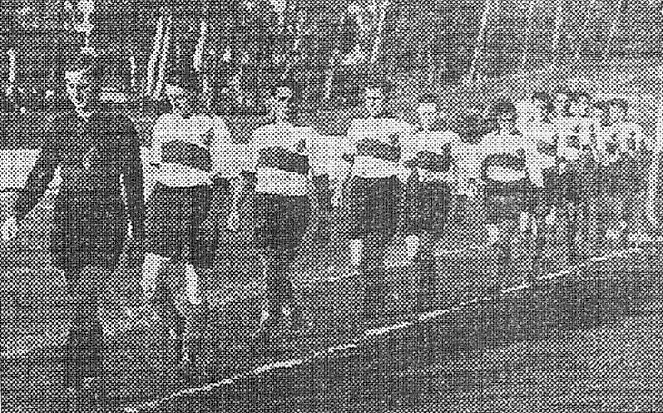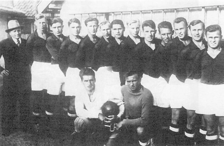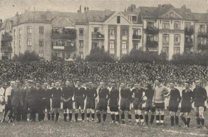 24 июля 1925 года. I Рабочие Олимпийские игры. Франкфурт-на-Майне. «Вальдштадион». Ярмарочная площадь. 8 000 зрителей. Германия ATSB – Швейцария SATUS – 6:0 (5:0). На переднем плане игрок швейцарской сборной (arbeiterfussball.de)
