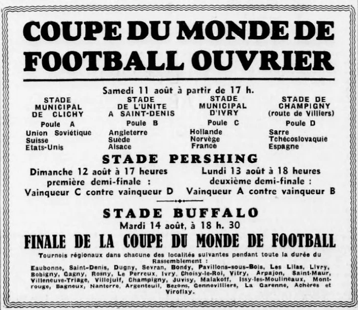 Но матчами на Кубок мира футбольная программа «Слета» не ограничивалась. «Более 50 иностранных футбольных команд в Париже. Помимо Кубка мира по футболу среди рабочих, который пройдет с 11 по 18 августа, в Париж приедет более 50 иностранных команд: восемь из Саара, десять из Эльзаса и Лотарингии, пять из Швейцарии, четыре из Испании, три из Чехословакии, по одной из Швеции и СССР и т. д. Во время «Слета» они сыграют с командами парижского региона. Дюжина провинциальных команд тоже собирается играть. Среди всех этих команд мы должны упомянуть Freie Rasenspieler Saarbrücker, одну из лучших шведских команд из Стокгольма, чемпионов 1933 года Швейцарии, Испании и т.д.» (еженедельник «Спорт» № 43 от 1 августа 1934 года).