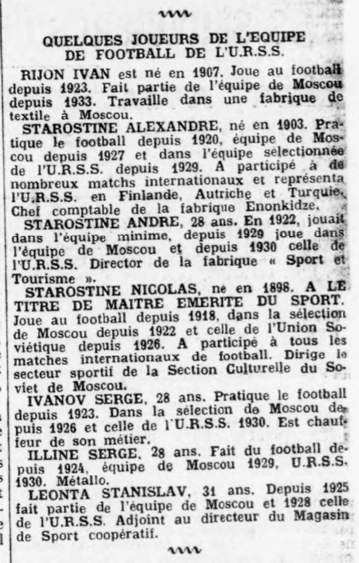 Старостин Андрэ, 28 лет. В 1922 году играл в юношеской команде, с 1929 года в сборной Москвы, а с 1930 года в сборной СССР. Директор фабрики «Спорт и туризм».