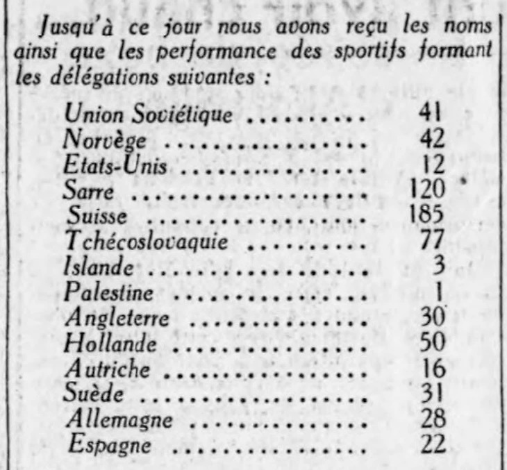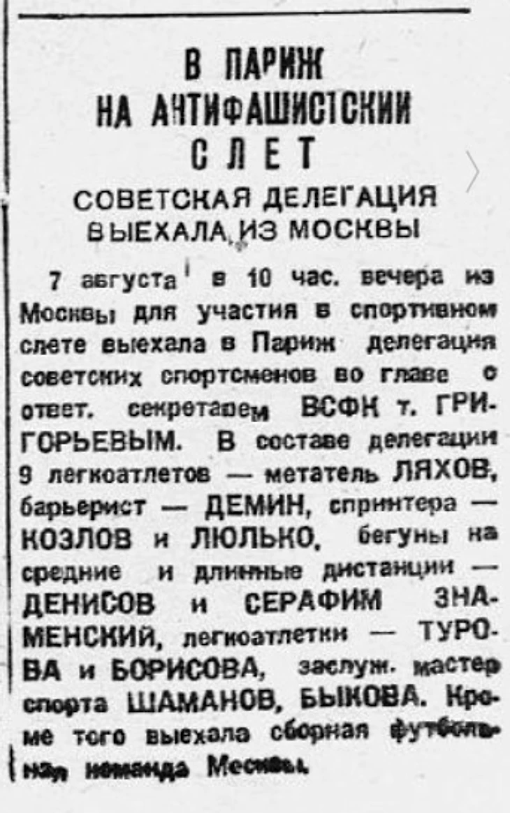 Август 1934 года. Большой Париж. Международный спортивный слет против войны и фашизма. «Некоторые приглашенные» (еженедельник «Спорт» № 45 от 8 августа1934 года) «Несмотря на громадные материальные трудности, в следствии хозяйственного кризиса, несмотря на террор, удалось собрать в Париже сильные делегации трудящихся спортсменов. <...> Наиболее сильная из иностранных делегаций была швейцарская, приехавшая в Париж экстренным поездом в количестве 336 человек. Затем следуют: Саарская область – 260, Эльзас-Лотарингия – 220, Норвегия – 70, Чехословакия – 50, Испания – 49, Англия – 44 и т. д. Представлены были даже заокеанские спортивные организации Америки и Канады – 5. Присутствовали также делегации из фашистской Германии – 13 и Австрии – 15» (журнал «Физкультура и спорт» № 18 за август 1934 года).