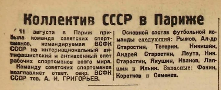 Август 1934 года. Состав футбольной делегации СССР на Международный спортивный антифашистский слет и Кубок мира КСИ по футболу (газета «Красный спорт» № 44 от 12 августа 1934 года)
